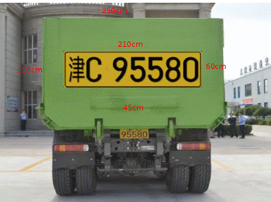 (2)车身后侧:以车帮上沿为准,向下移动至车身中央位置正向喷涂,号牌底边距车帮下沿45cm,侧边距离车身侧帮各20cm,尺寸为210cm×60cm。(附件3)